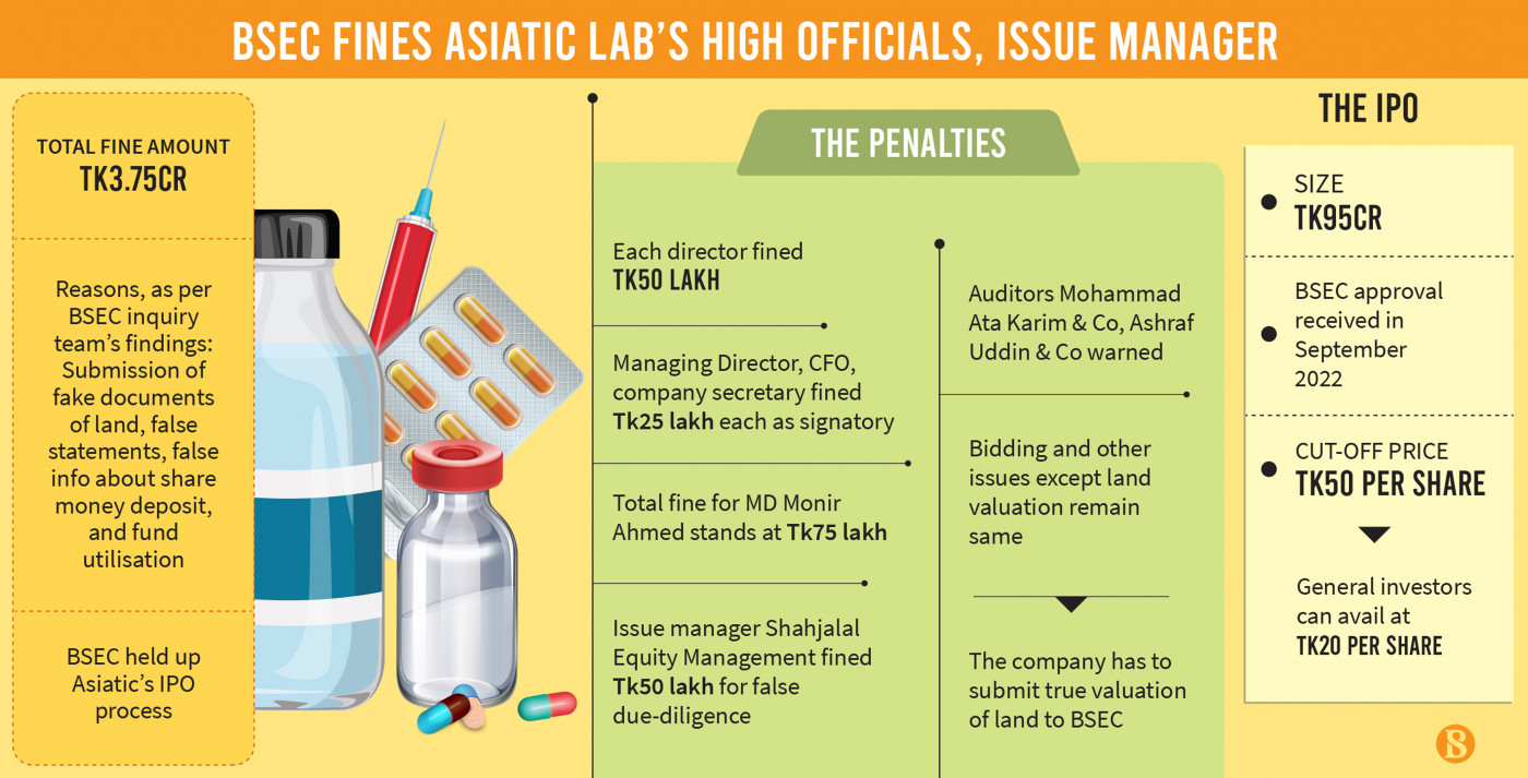 Additionally, Managing Director Monir Ahmed, chief financial officer, and company secretary of Asiatic Laboratories, in their roles as signatories in the prospectus, are each facing fines of Tk25 lakh.