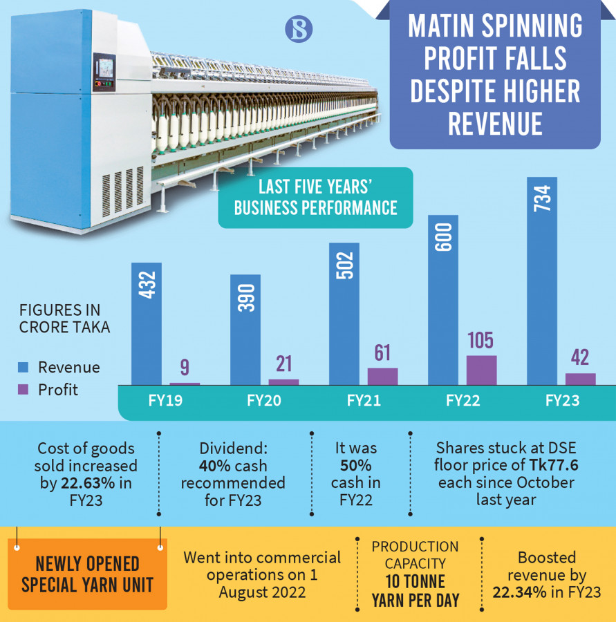 Matin Spinning Mills' year-on-year profit for fiscal 2022-23 declined by 59% to Tk42.71 crore due to cheaper yarn and the rising costs caused by the appreciation of the dollar against the taka.