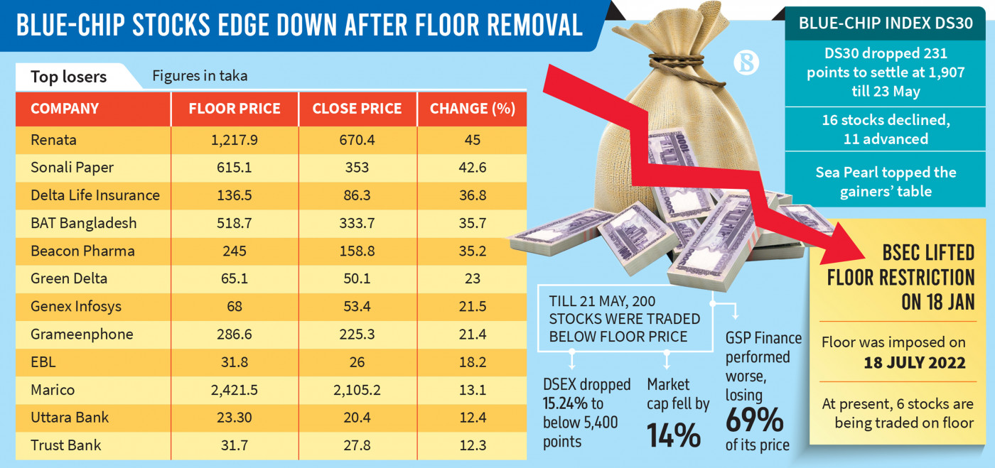 Meanwhile, around half of the stocks on the Dhaka bourses have witnessed a significant price erosion as investors were hurried to sell their holdings after the removal of the floor price.
