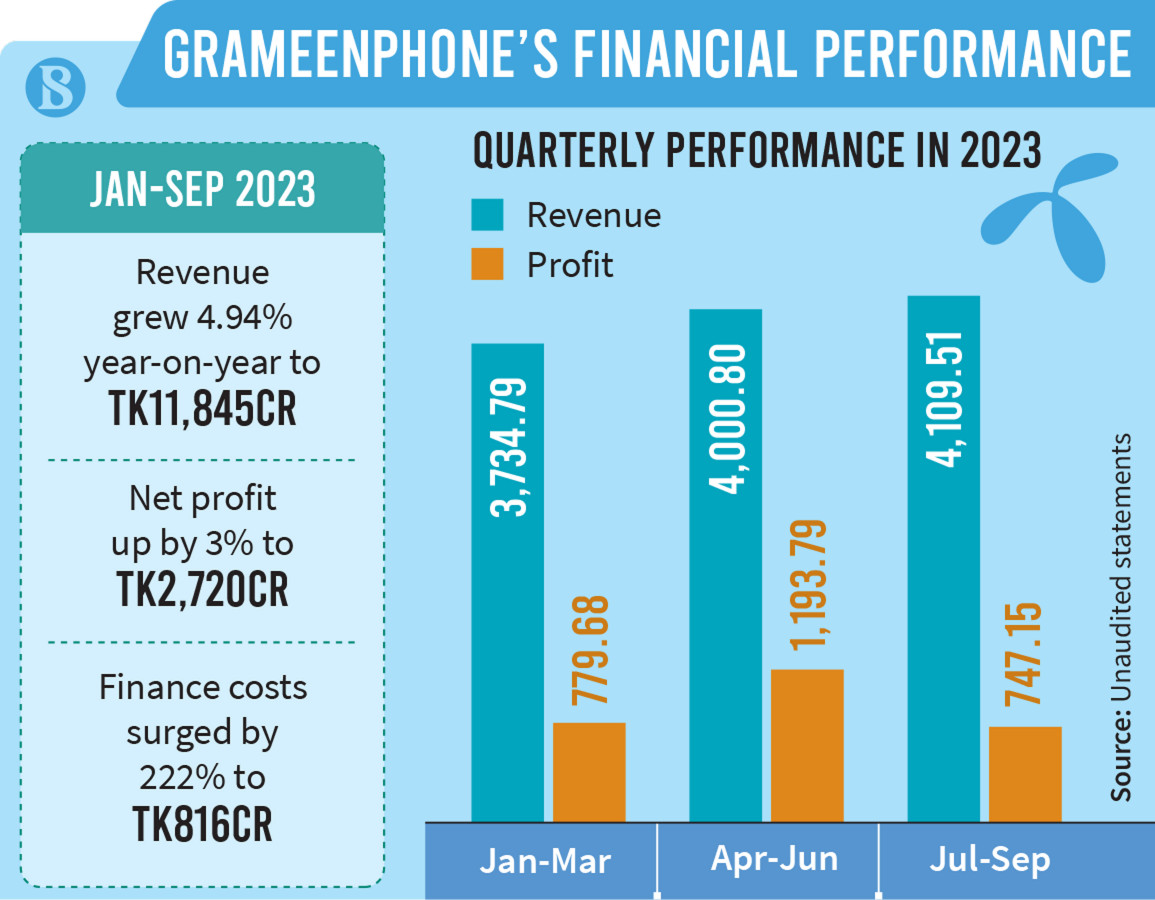In this year's January-September period, Grameenphone's revenue stood at Tk11,845 crore, net profit at Tk2,720 crore, and finance expenses at Tk815 crore.