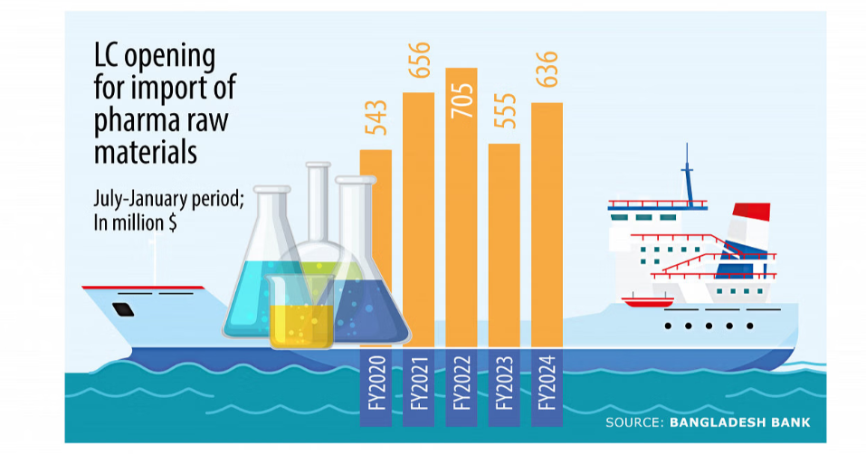 The opening of LCs to import raw materials for the pharmaceutical sector increased by 14 percent to $636.26 million year-on-year during the July-January period of the current fiscal year, Bangladesh Bank data shows.