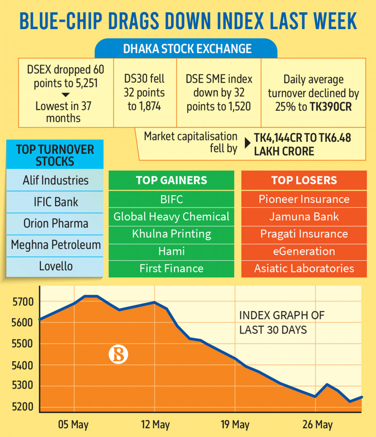 Meanwhile, DSEX, the broad index of DSE, plunged by 60 points to settle at 5,251 points last week, the lowest in 37 months. Blue-chip stocks mainly played a pivotal role in dragging down the index.